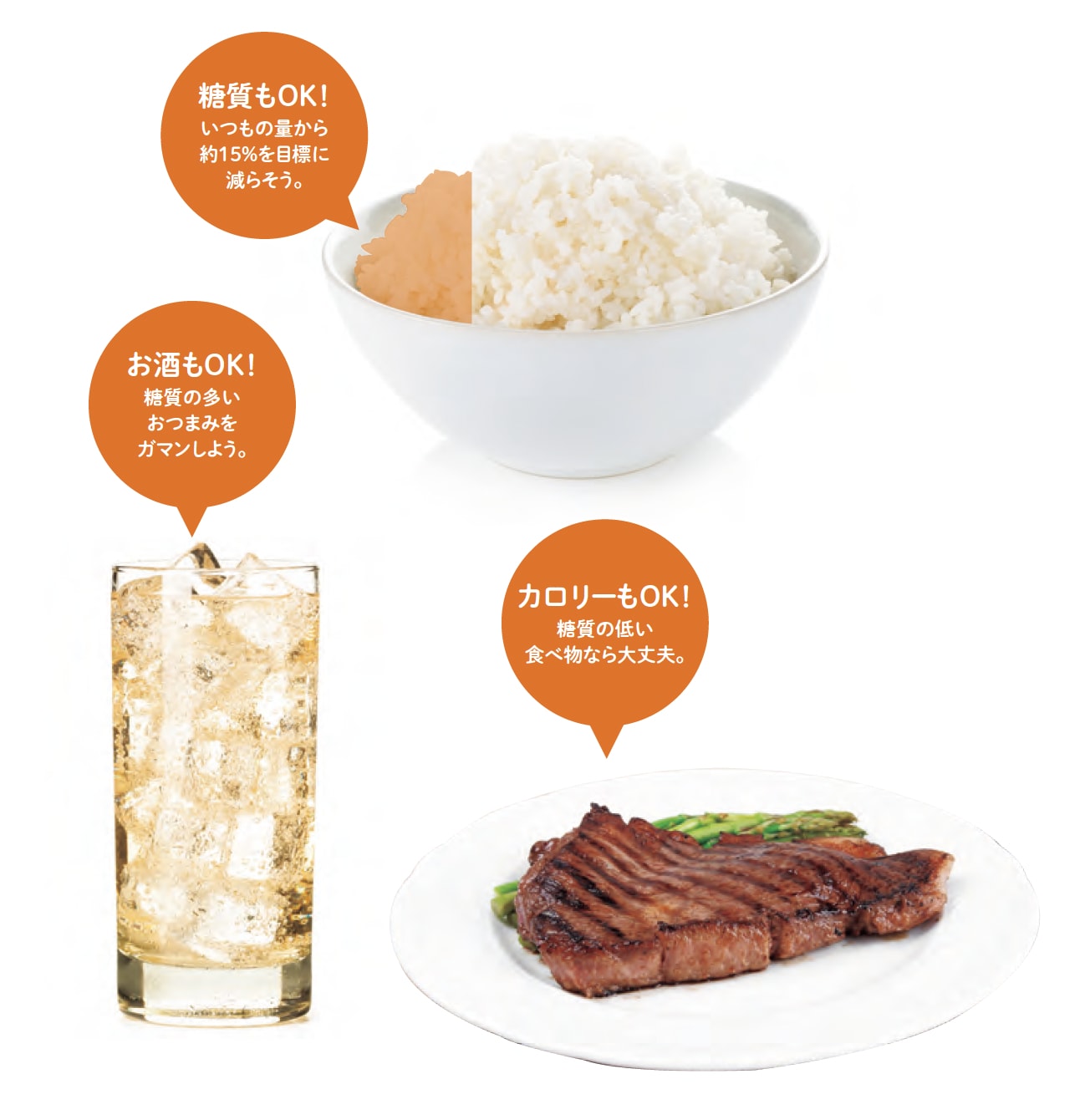 軽めの脂肪肝は、糖質の摂取量を少しだけ減らす緩やかな食事制限で改善することができます。具体的にいうと、ごはんやパン、めん類などの主食を、いつもより約15%減らすだけです。野菜でもじゃがいもやさつまいもなどのいも類は糖質が多く含まれていますので、注意が必要です。また、毎日ジュースを飲んだり、お菓子を食べたりしている人は、それらを控えるだけでも効果が見込めるでしょう。1日の糖質摂取の適正量は、男性が250グラム、女性で200グラムになります。糖質をほとんど含まない肉や魚、卵などを中心とした食生活に見直すことが脂肪肝を治す近道です。