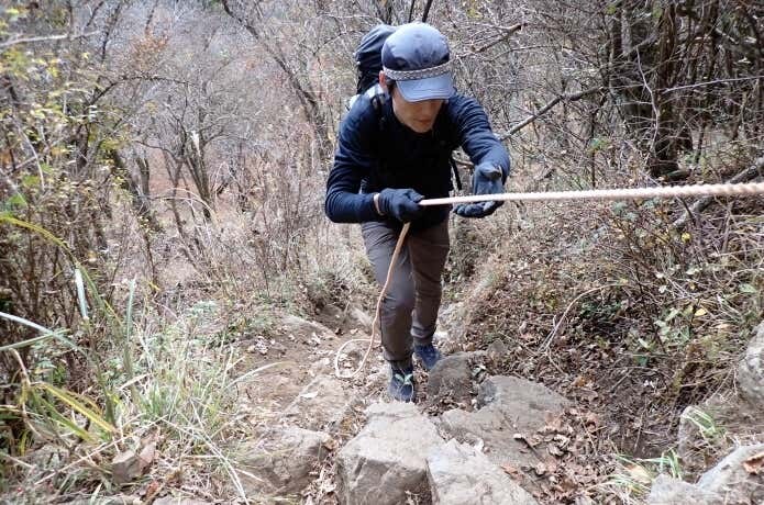 急傾斜でロープを伝うシーンでは、ストレッチのよさを体感しました。ストレスなく動けるので、行動に集中できます。