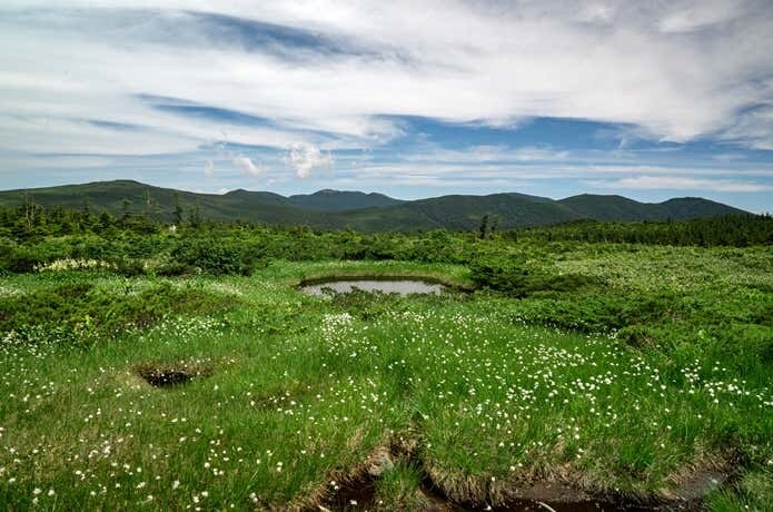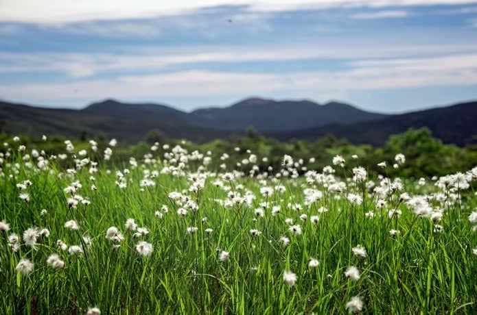 ブナ林を抜けると湿原が広がり、木道の先にはワタスゲやチングルマが咲き誇る。