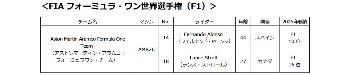 F1に関し、2026年はAston Martin Aramco Formula One Team(アストンマーティン・アラムコ F1チーム:AMAF1)に、ワークスパートナーとしてパワーユニットを供給する形で、FIA F1世界選手権に参戦する。