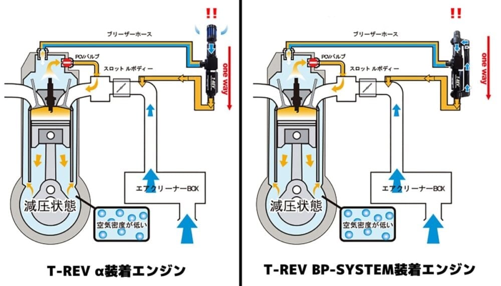 これにより、抜いて内圧が下りすぎたら外気を取り入れる=内圧が上下して安定しきらなかった「T-REV α」と比べ、「T-REV BP」は状況に応じて循環させることで内圧を適正値に整え、エンジン内圧の安定化につながる=減圧の効果が低回転から高回転まで安定した。