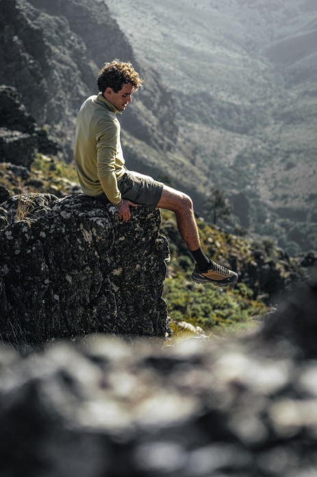 透湿防水性、クッション性、グリップ力をバランスよく搭載。岩場や木の根の多い低山でも安心感があり、長時間歩いても疲れにくい設計です。