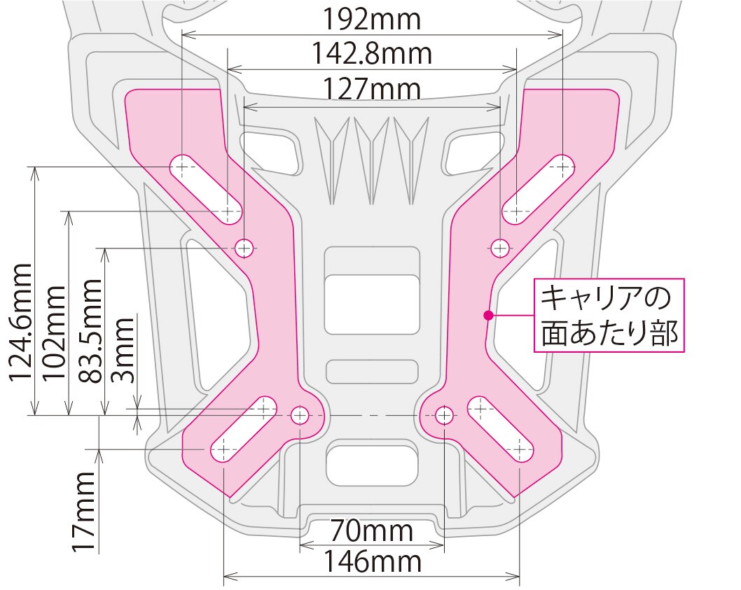 リアキャリア本体にはアルミダイカスト製を採用し、裏面に立体リブ成形を行っている為、優れた強度を実現しております。積載耐荷重10kg。