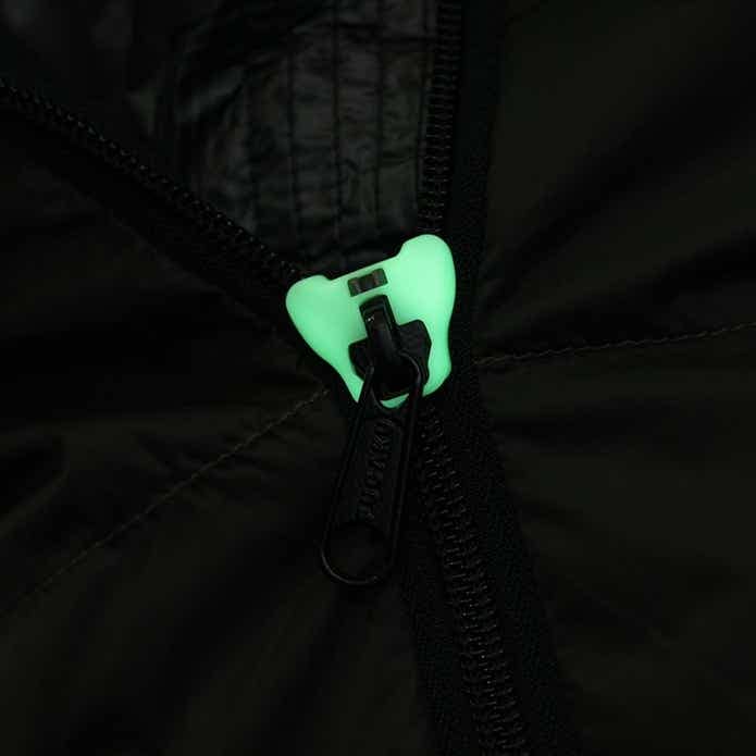 サイドのファスナーは裏側にもツマミがあるタイプで、中に入った状態での操作性が高く、スライダーは蓄光タイプで暗いところでの視認性も良好!