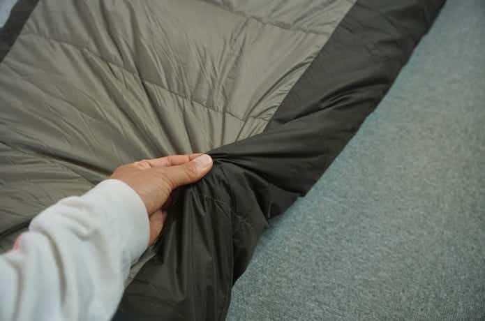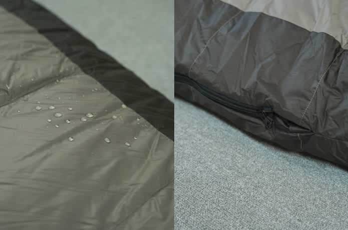 表地にはしっかり撥水加工が施され、テントに付いた結露が垂れたりしても心配無用。濡れると保温性が下がってしまうダウンにとってはありがたい機能です。