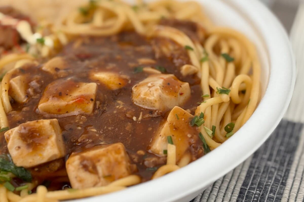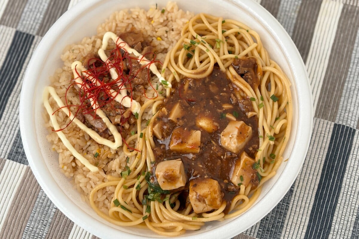 温め完了後、フタをオープン。容器内はちょうど真ん中から、麻婆豆腐がかかった焼きそば、鶏肉チャーシューとマヨネーズがのせられた炒飯風ごはんに分けられています。