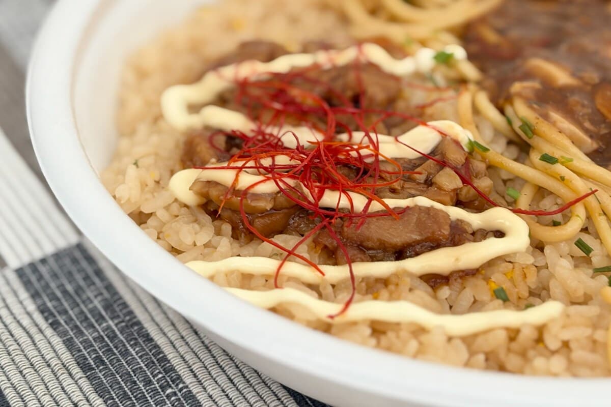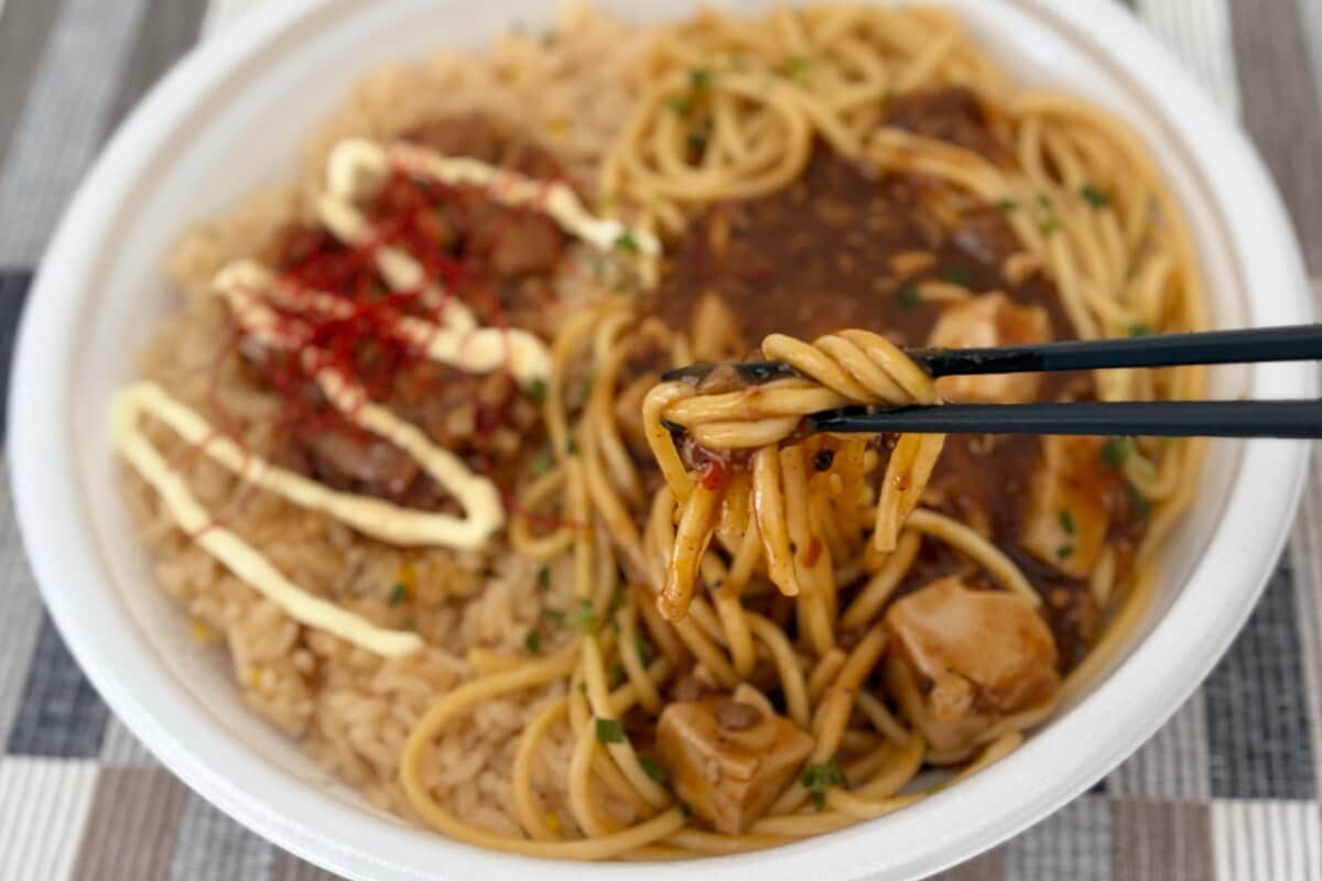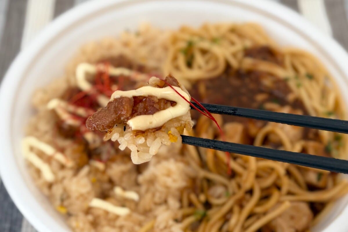 続いて、炒飯風ごはんをパクリ。鶏肉チャーシューは醤油ダレでしっかりと味付けされていて、パラパラのごはんと好相性です。そこにマヨネーズと糸唐辛子が濃さをプラス。焼きそばに負けじと、ガッツリ系の味わいに仕上がっています。