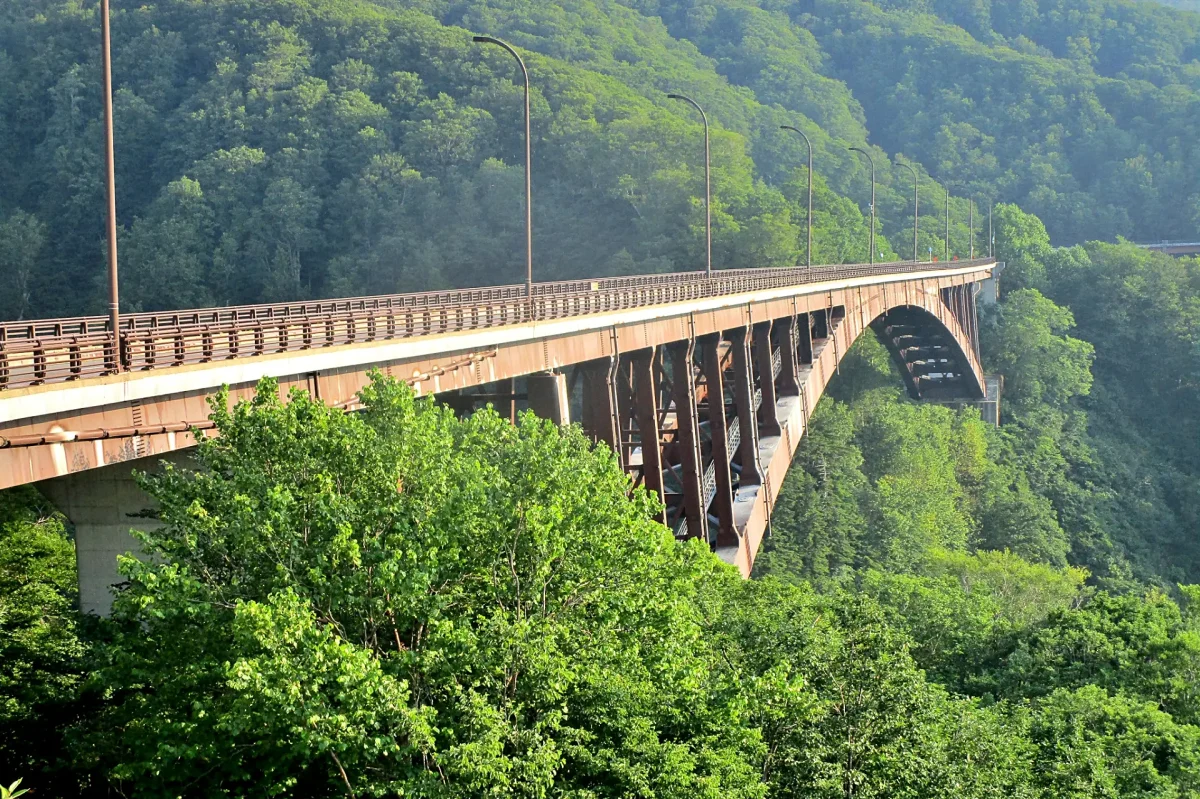 青森から八甲田・十和田ゴールドラインの国道103号で萱野高原まで行くと、八甲田山の主峰群を一望する。八甲田山が青森に近いのを実感。酸ヶ湯温泉を過ぎると、北八甲田と南八甲田を分ける傘松峠を越える。酸ヶ湯温泉の手前を右折して国道394号を行けば、城ヶ倉大橋で八甲田の深い谷をまたぐ。ここも絶景!
