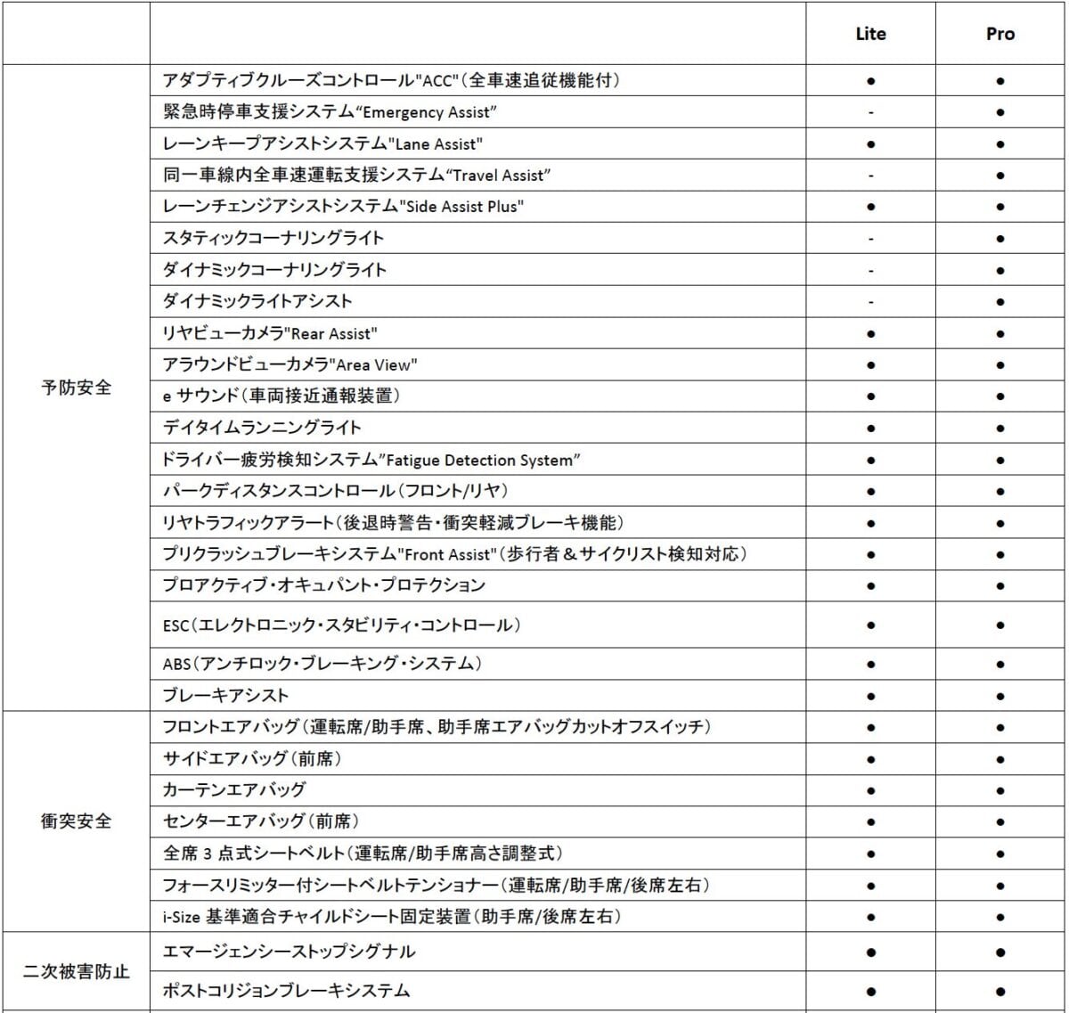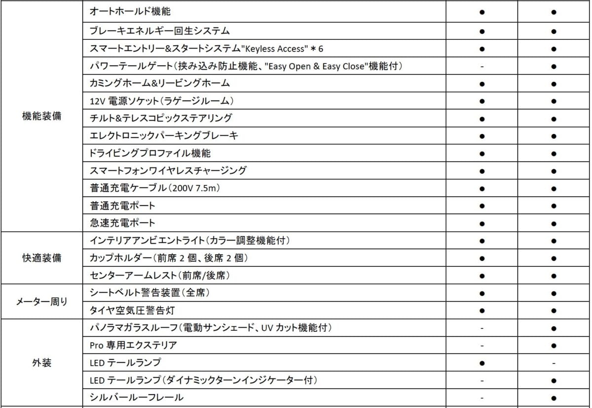 ● : 標準装備 – : 設定なし