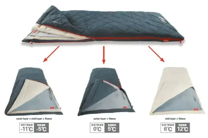 アウトレイヤー・ミッドレイヤー・フリースの3層構造になっており、組み合わせを変えることで快適温度や使用下限温度を調整できるのが最大の特徴。気温やシーンに合わせて柔軟に使えます。さらに、同モデル同士を連結すれば幅約180cmとなり、親子3人でもゆったり就寝可能。ファミリーキャンプにも心強い一品です。