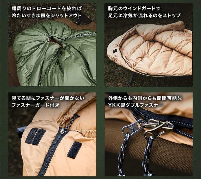 顔まわりからの冷気侵入を防ぐ構造や、足元にゆとりを持たせた台形デザインで、快適性にも配慮されています。収納バッグにはコンプレッションベルト付きで、しっかり圧縮できるため持ち運びもスムーズ。