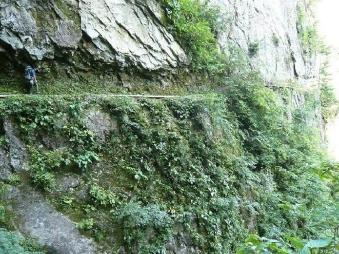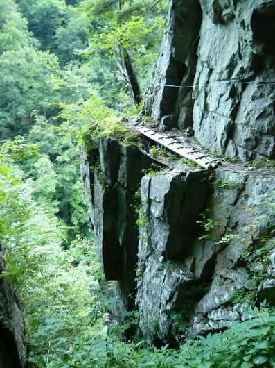 序盤の難所となる、大ヘツリは特に幅が狭く、急な断崖をはしごで登ることになります。コース中、特に高度感がある場所です。
