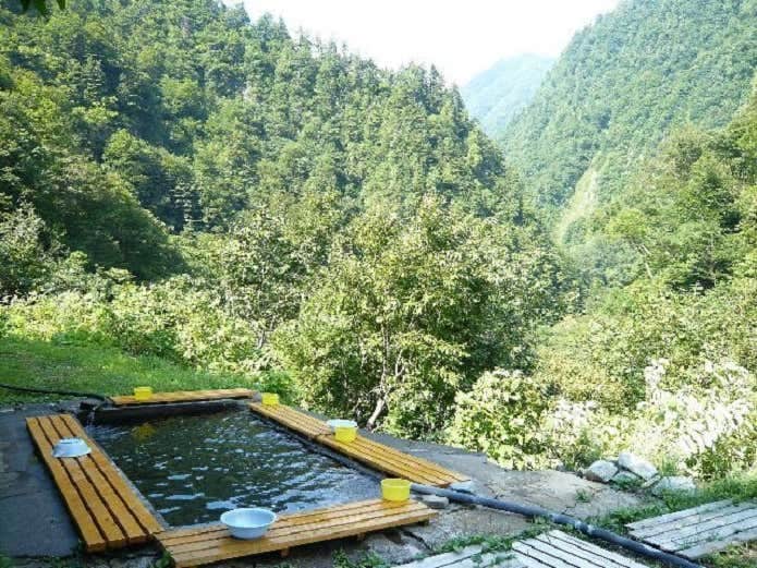 仙人谷ダムから約1時間ほどで阿曽原温泉小屋に到着です。小屋から数分下ったところには温泉があり、有料で入浴することも可能です。360度の大自然に囲まれた温泉は、まさに至福のひと時。