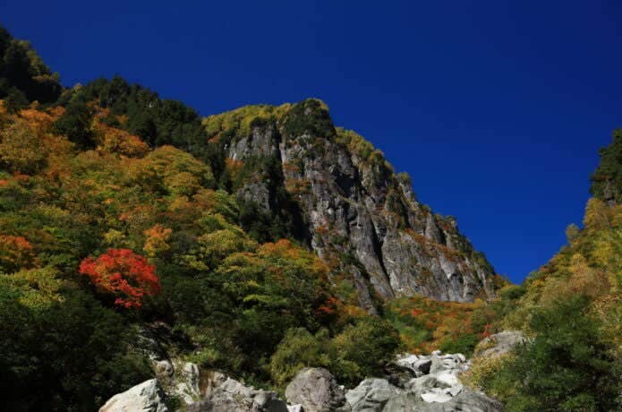 下ノ廊下は美しい紅葉を眺められる絶景スポットでもあります。青く透き通った黒部川と荒々しい岩に映える色とりどりの紅葉は、まさにここでしか見ることができない景色でしょう。標高はそこまで高くないため、見ごろは北アルプスのほかのエリアより少し遅く、例年10月中旬ごろになります。