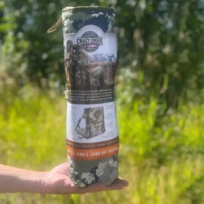 厚さ約4cmとコンパクトに折りたためるクレイジークリーク「HEX2.0 オリジナルチェア」。コンパクトながら座面にはフォーム材が封入されているので座り心地も良好です。カラーは4色あり、無骨な見た目のカモ柄は焚き火との相性も抜群。