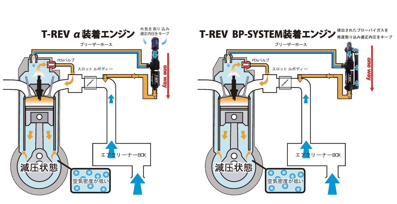 これにより、抜いて内圧が下りすぎたら外気を取り入れる=内圧が上下して安定しきらなかった「T-REV α」と比べ、「T-REV BP」は状況に応じて循環させることで内圧を適正値に整え、エンジン内圧の安定化につながる=減圧の効果が低回転から高回転まで安定した。
