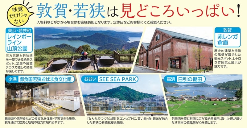 このプランは、地域の道の駅や観光施設で特産品などと交換できる「おみやげ引換券」が付いた期間限定の特別企画。食以外にも「レインボーライン」「御食国若狭おばま食文化館」「SEE SEA PARK」「日引棚田」など観光も充実している。アクセスは、東京から敦賀まで、北陸新幹線で最短3時間8分、大阪からも最短1時間9分。