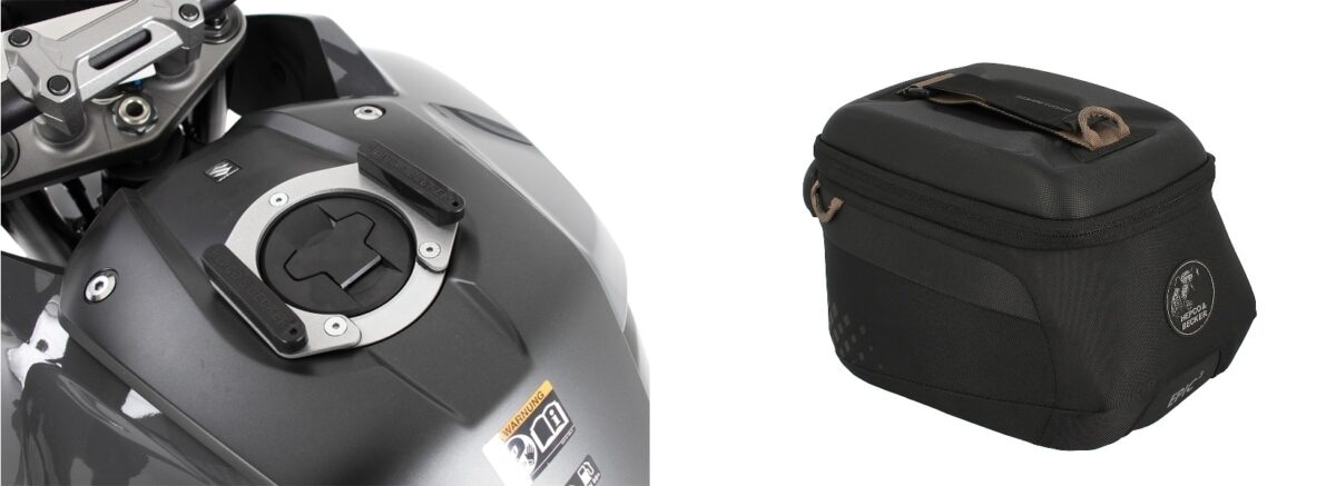 財布やスマートフォン等の身の回り品を入れるのに便利なタンクバック。取り付け部のマグネットは給油口回りにリング状に取り付けるので、タンクのデザインの邪魔になりません。脱着が容易なので、給油時でも取り外しにわずらわしさは感じないでしょう。