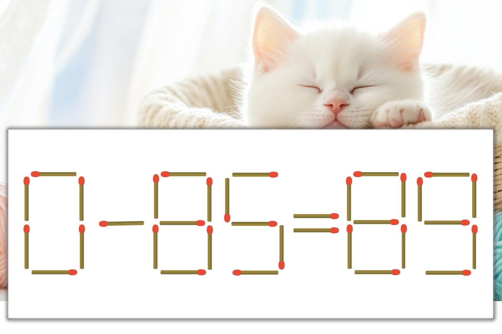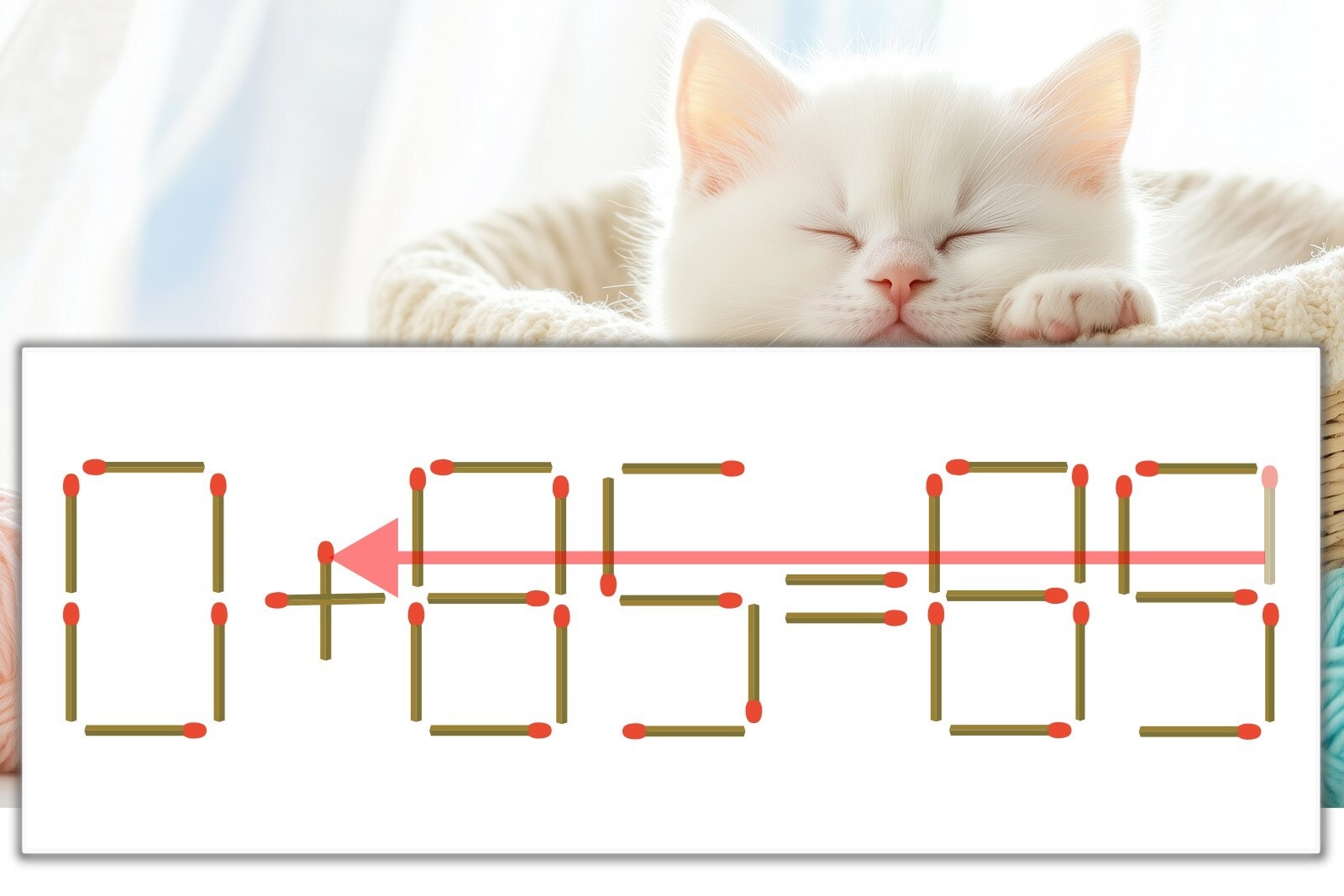 「9」を別の数字に変化させると答えが導き出せます。「9」のマッチ棒を1本移動して、「-」を「+」にしてみましょう。すると、「0+85=85」が成立します。