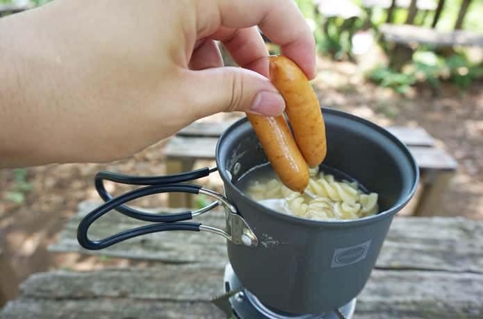 ウインナーを投入。パスタの茹で時間から逆算して、ウインナーの投入のベストなタイミングを計りましょう。