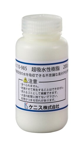 高吸収性ポリマーは、おむつや女性用品、緊急用トイレなどに使われている素材。一度固めてしまうとある程度の圧力をかけても水漏れしないので、ザックの中に入れて持ち帰っても安心です。