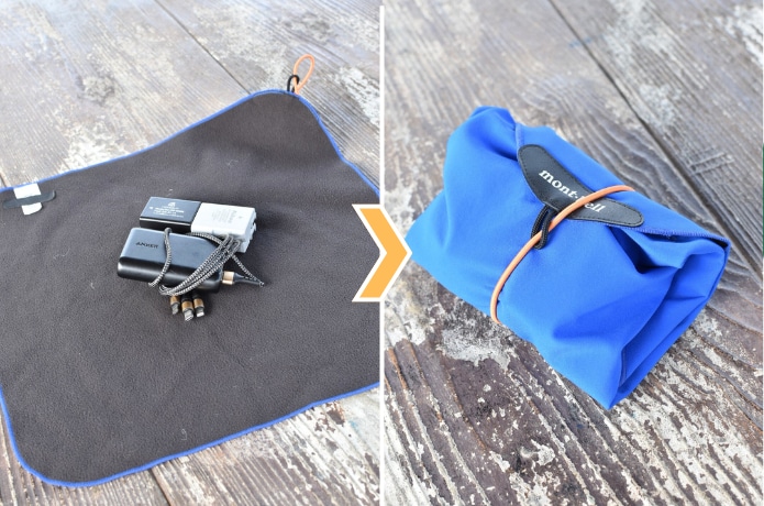 スマホ用のモバイルバッテリーやカメラ用のサブバッテリーなどをまとめるのにぴったり。濡れから守りつつ、バラバラとしないようにまとめることができます。