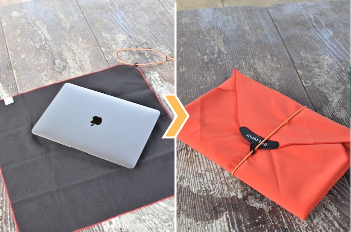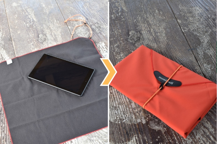 小型の一眼レフや、ミラーレスカメラにぴったりのサイズ感。バッテリーや小型ガジェットの保護にも使いやすく、マルチに活躍します。1人分のレジャーシート代わりにもOK。ただし11インチのノートPCは包めませんでした。
