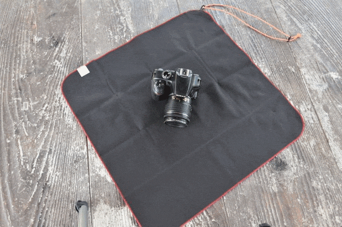 構造は驚くほどシンプル。正方形の生地の隅にゴムバンドがついていて、カメラをくるっと包んで留めるだけ。シンプルだからこそ気軽に使える、優秀アイテムです。
