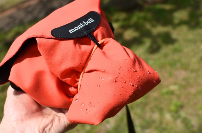 隙間ができてしまうため完全防水ではありませんが、生地には防水性と撥水性があり、小雨程度なら凌げる場合も。試しに水をかけてみたところ、しっかり弾いてくれて、中まで染みることはありませんでした。隙間から水が入らないよう注意が必要ですが、急な天候の変化にも、ある程度なら対応してくれそうです。