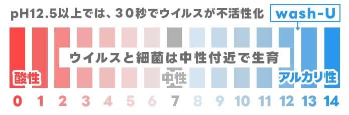 大部分の細菌は、pH12.5以上のスーパーアルカリイオン水で死滅します。wash-UはpH12.5。身体への影響が限りなく少なく、かつ除菌効果を発揮する成分があります。