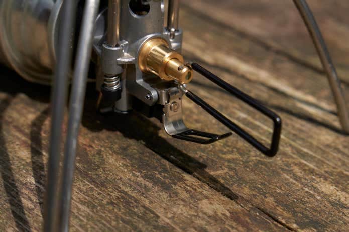 軽量化にあたり、ゴトクは3本で設計されました。そして、ガス缶装着部側に位置する1本は、足の部分を大胆にカット。CB缶を取り付けていないとかなり不安定に見えますが、横向きのCB缶が台座として機能するので、安定してクッカーを乗せることができます。
