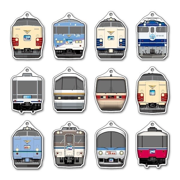 特に注目したいのはトレーディングアクリルキーホルダーの車両ラインナップ。「183系」「185系(フルフル塗装)」「583系(国鉄色・きたぐに旧塗装)」「EF64形(ユーロライナー色)」「キハ181系(はまかぜ色)」など、懐かしさで胸が熱くなる車両が勢ぞろいしています。