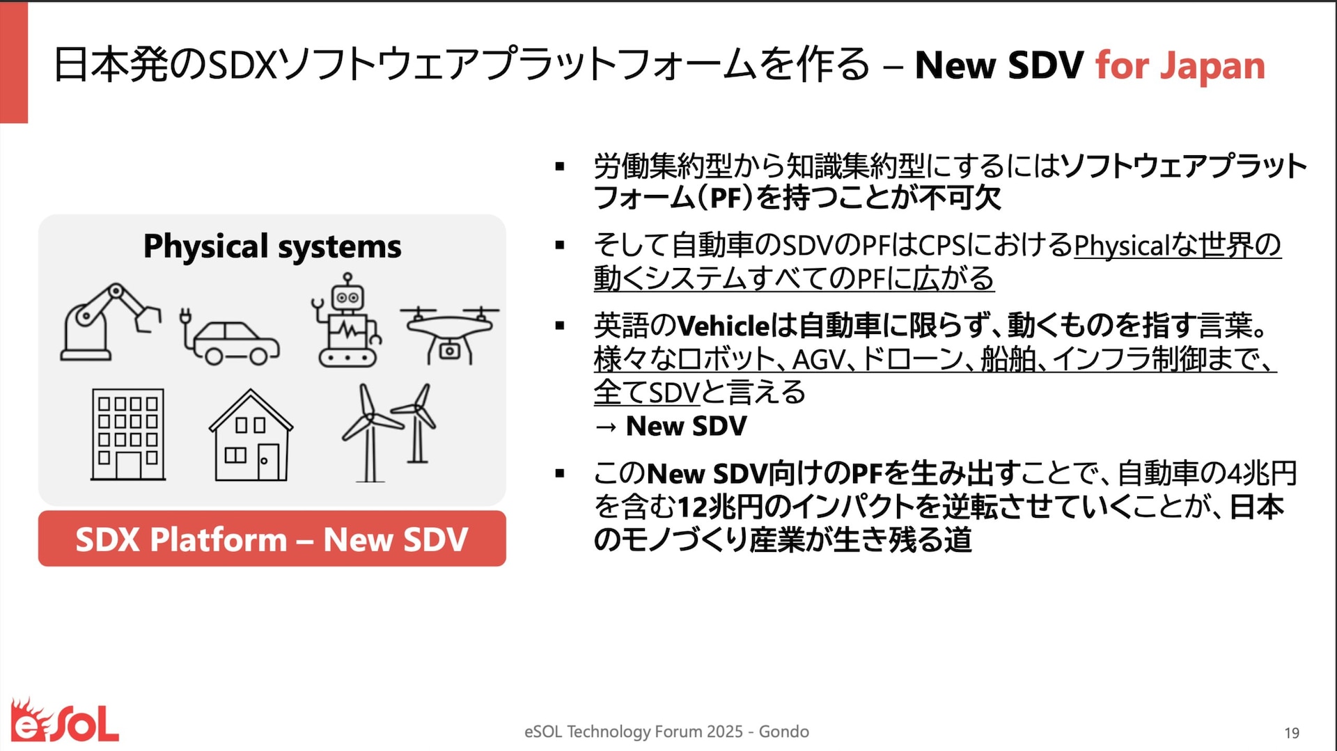 簡単に言えば、各社が共通言語をもったシステムでオリジナルのSDVを開発し、味付けができるように支援していく。そしていずれ日本がワンチームになれた時には、共通のプラットフォームを持つことで、各社の味はありつつ、共通言語もあり、グローバルでは際立つ存在になっていくということだ。
