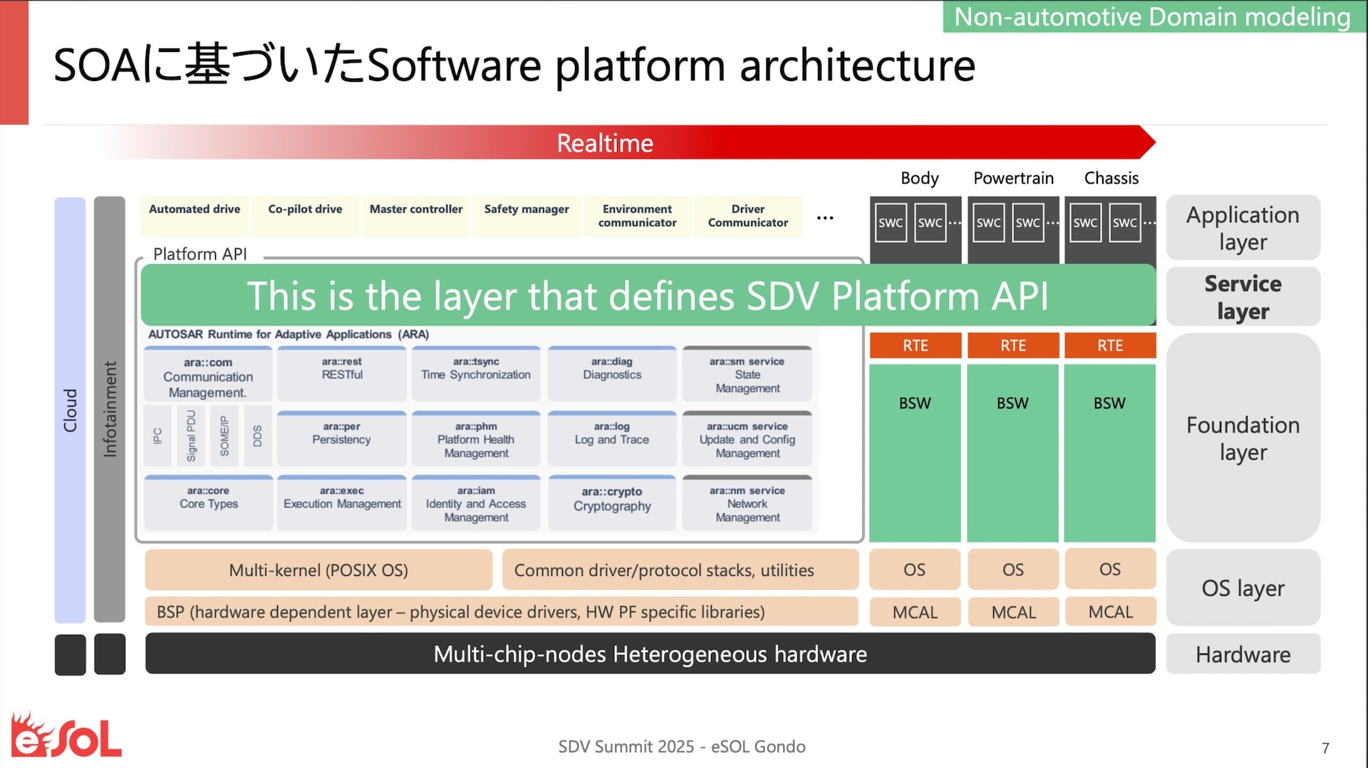 そこでeSOLとしては、「その時代が来る前に各OEMのカスタムプラットフォームに近いアーキテクチャーや構成、考え方を持つことができるように各社を支援し、結果的に将来の統合がスピーディに、そして破壊的ではなく実現し、勝てる日本のOEMのアライアンスが実現できるようにしたい」というロードマップを描いているのだ。