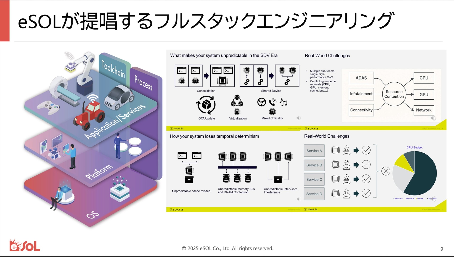 そこで権藤社長のeSOL社では、この車両全体のプラットフォームの実現のために、OS開発からプラットフォームの開発、そしてミドルウエアの搭載、そしてアプリケーションの搭載まで全領域で開発を行ない、SOAを構築しOEMをサポートする「フルスタックエンジニアリング」で対応するということに取り組んでいるのだ。