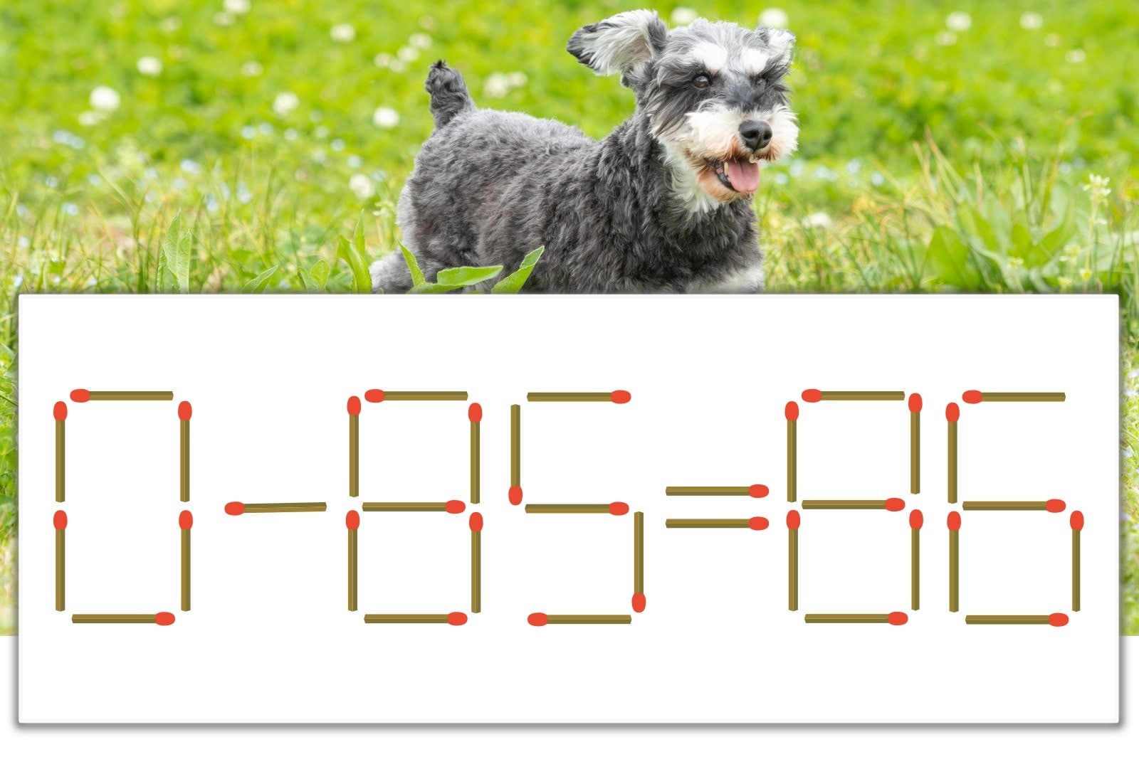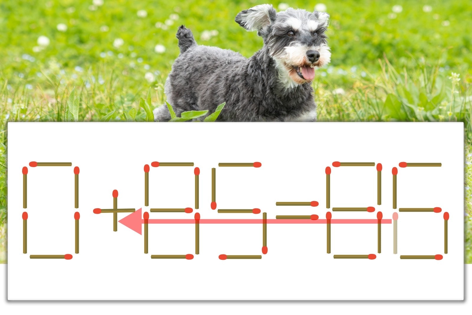 「6」を別の数字に変化させると答えが導き出せます。「6」のマッチ棒を1本移動して、「-」を「+」にしてみましょう。すると、「0+85=85」が成立します。