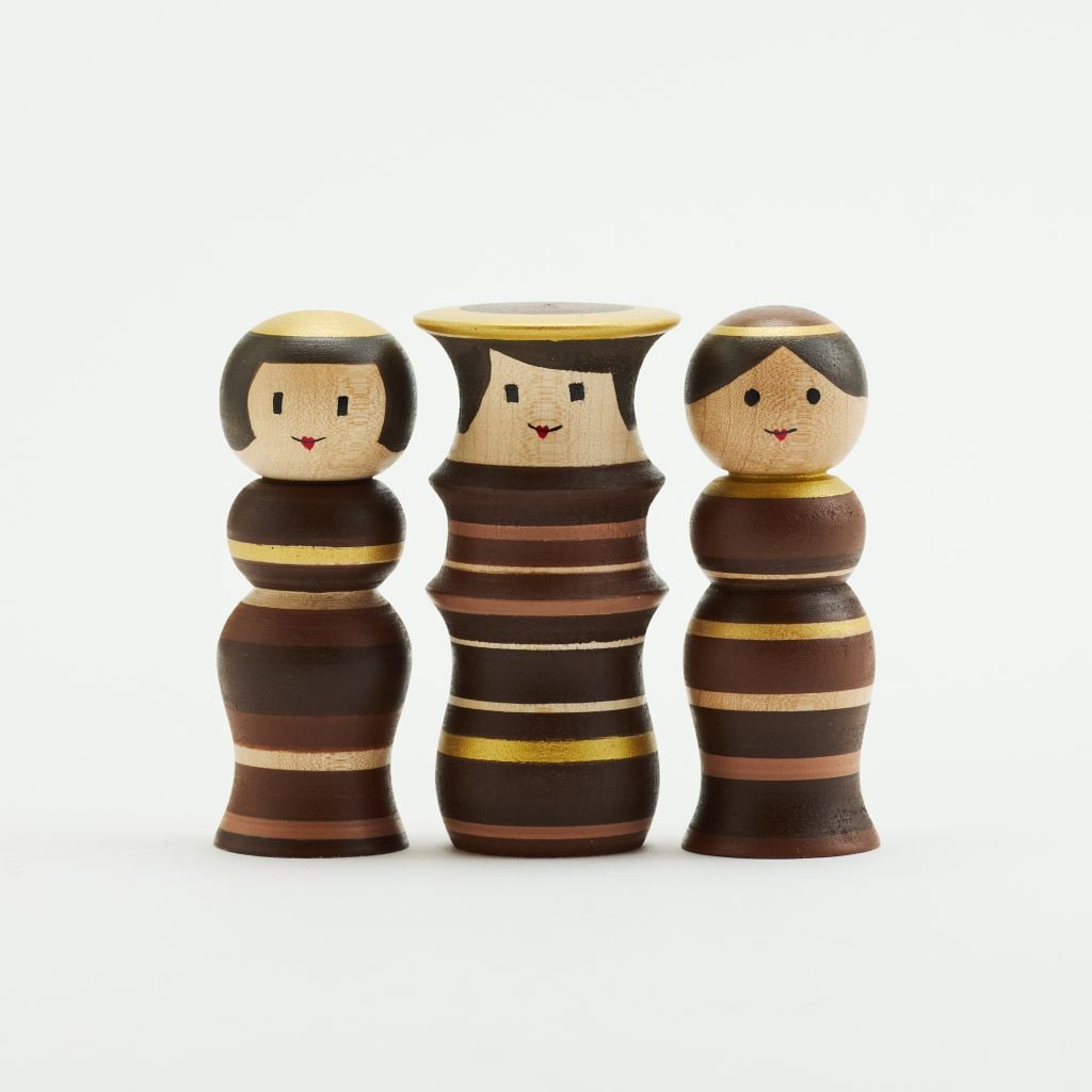 「ルビンのこけし」3体がセットになったのが、ノック・ノック・ワールド「『ルビンのこけし フレンド』チョコレートカラー」(同7700円)。3体の幅が約12センチメートル(高さ約7.8センチメートル)と、手のひらに収まる飾りやすいサイズ。昨年人気を集めたチョコレートカラーを期間限定で再販売する。茶色とゴールドの落ち着いた色合いは、バレンタインギフトにもぴったりだ。