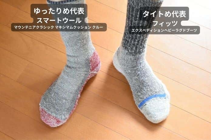 まずは「ゆったりめ靴下」と「タイトめ靴下」を比べて検証。ゆったり代表として選んだのは「スマートウール マウンテニアクラシック マキシマムクッション クルー」、タイトめ代表として選んだのは「フィッツ エクスペディションヘビーラグドブーツ」です。