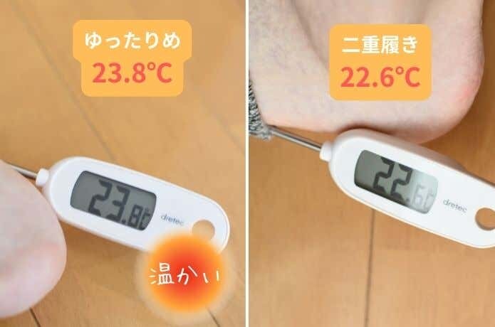 二重にした方はかえって足が冷たくなる結果に。靴下を重ね履きすることは必ずしも足を暖めることにはならないようです。