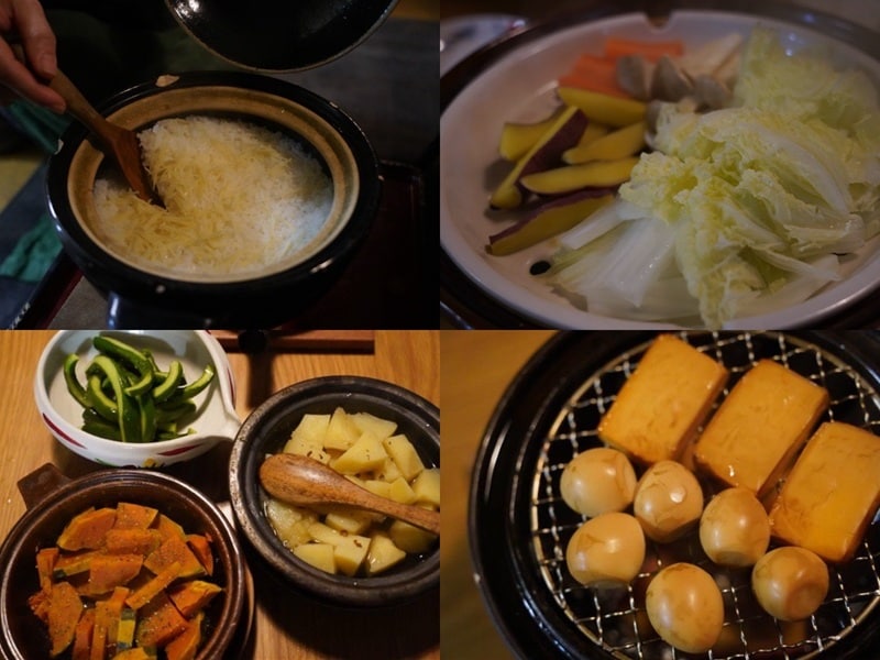 夕食と翌日の朝食は、地元の食材を使った体にやさしい郷土料理が楽しめる。宮川さんの特製手料理だ。宮川さんはとにかく土鍋が大好きで、前菜から始まり最後のデザートまですべて土鍋で調理し、提供される。「食卓はみんなで食べて囲むことが大切で、おいしいところには人が集まる」という言葉を大切にしている。そんな時間を共有するには土鍋がピッタリだという。