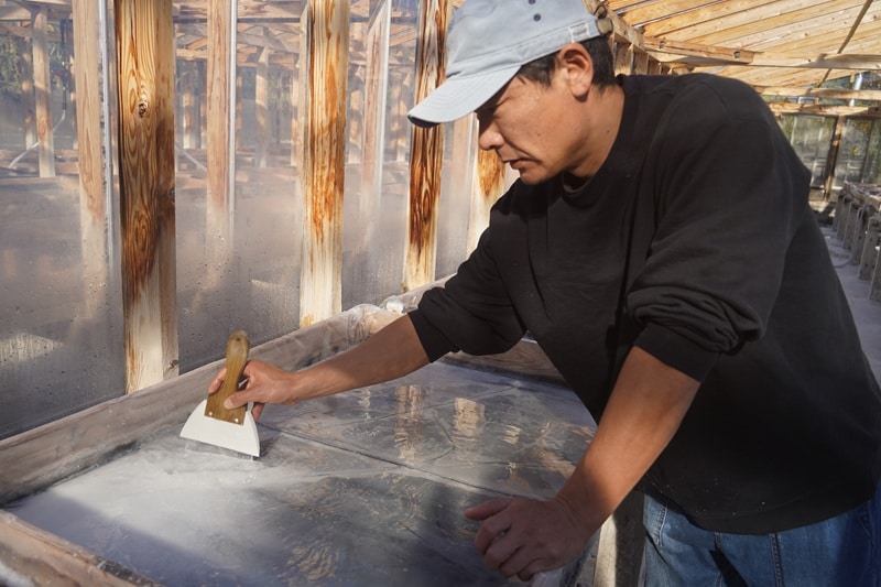 高知は比較的日照時間が長く、温暖な気候であるため、天日製塩に適している風土だとされる。まず、満潮のタイミングでくみ上げた海水を「採鹹(さいかん)」というタワーで循環させる。この工程で少しずつ蒸発させ、海水の濃度が増した状態「鹹水(かんすい)」になる。その鹹水をハウス内でさらに蒸発させて結晶化させる。固まらないように数回、混ぜる作業を毎日行う。最後に脱水をして、結晶化した粒が塩となり、水がにがりとなる。天日塩になるまでには、時期や天候で異なるが、一連の作業期間は1~2か月程度かかるという。自然相手の塩作りには、時間も手間も惜しまなく注がれている。