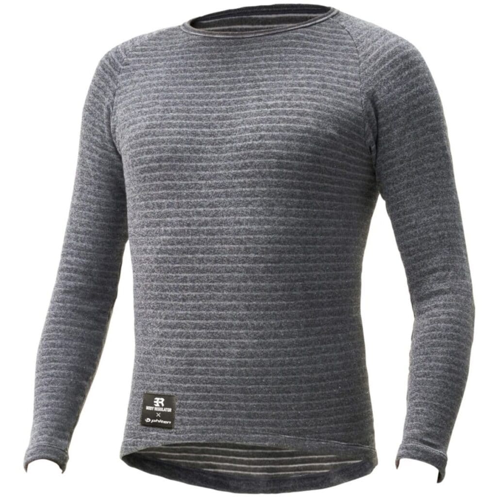 フライス編みによる高いストレッチ性とポリウレタン糸の効果で身体にしなやかにフィットし、中肉厚の生地構造が冷気を遮断して保温性を向上。さらに起毛加工で肌触りが良く、着た瞬間から暖かさを感じやすい。吸湿発熱素材「サーモギア」により空気を多く含んで熱を保持し、ファイテン社のアクアチタン含浸糸がリラックス状態をサポートするなど、多面的に快適性を追求したウエアとなっている。