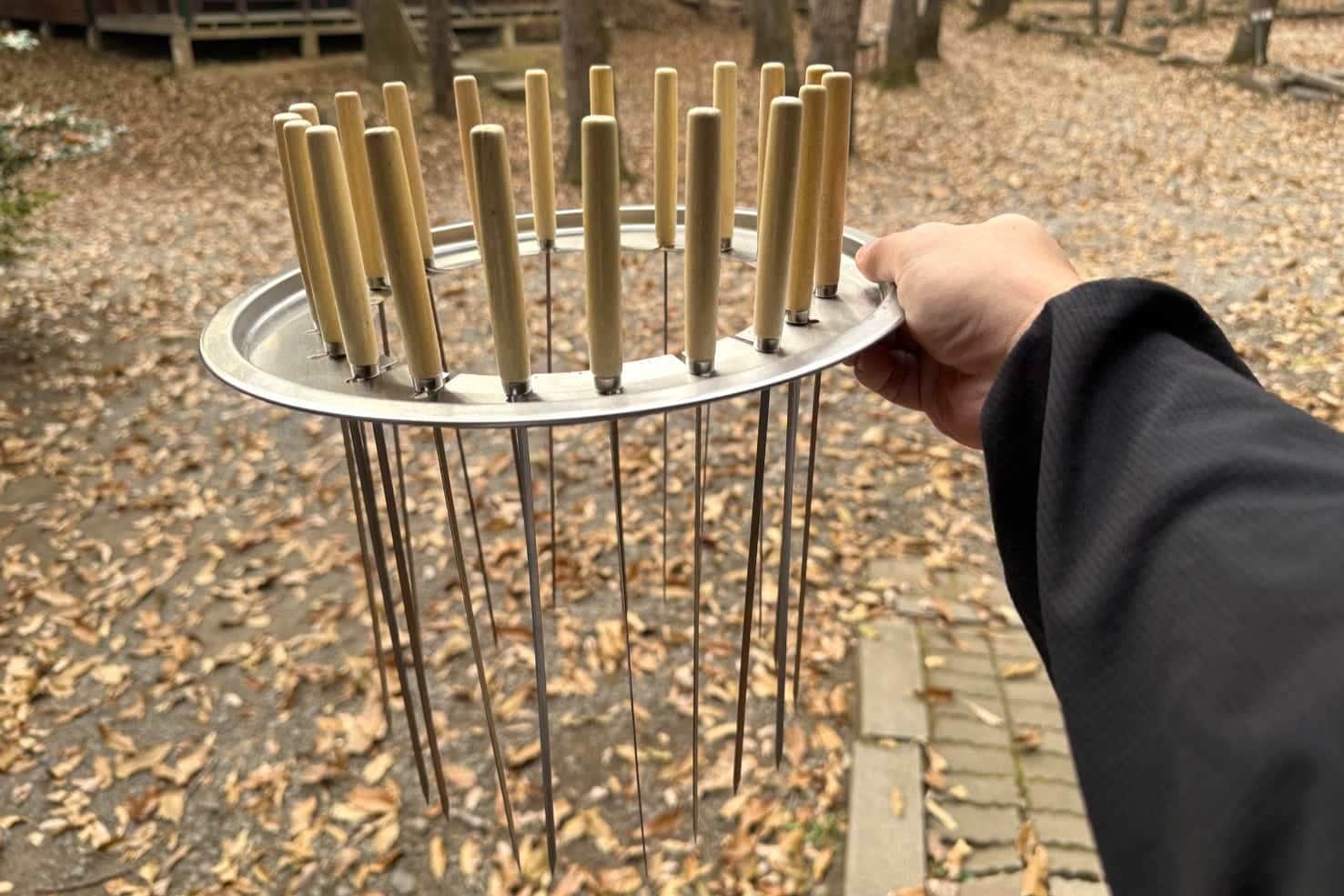 木製ハンドルの専用肉串が20本と、これらを吊るした状態で固定するスタンドが付属しているんです。セットしてみるとご覧の大迫力で、思わず笑っちゃうビジュアルに。