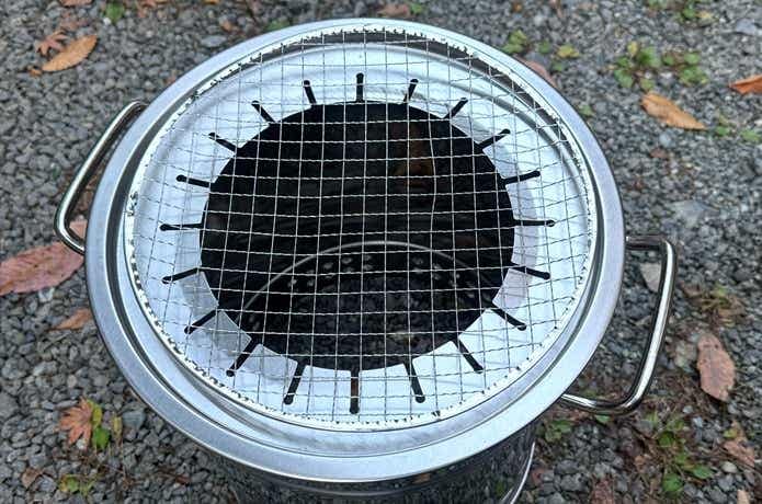 灰受け皿には「炭バケツ」と呼ばれるパーツを画像のように乗せ、ここに炭を詰めて熱源とします。ここからの輻射熱でこんがりと食材を焼くわけです。