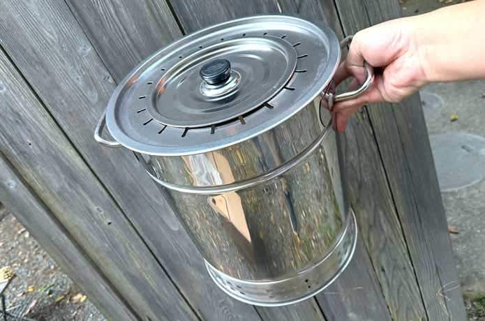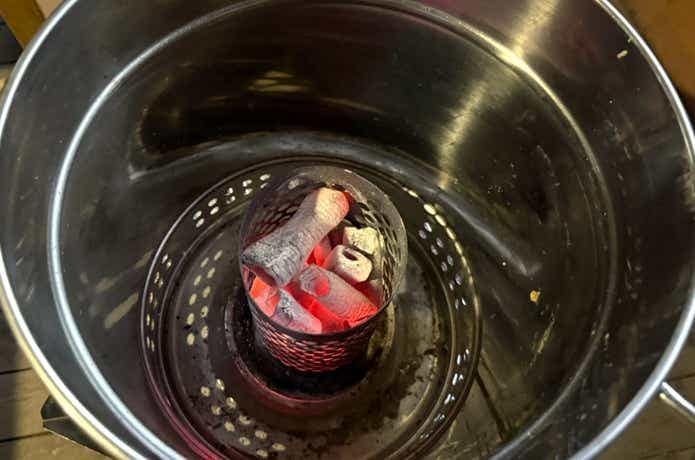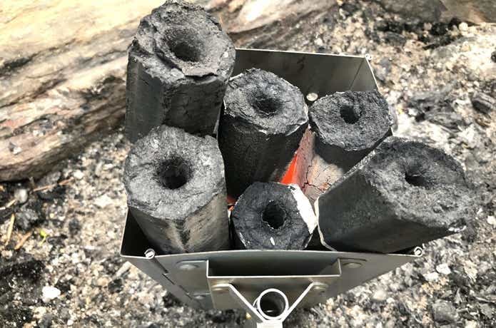 チャコールスターター等で完全に着火してから、バケツに詰めるのでもOK。構造的には、着火剤を下に置いてから炭をバケツに詰めれば、それだけでもすんなり燃えたかもしれません。