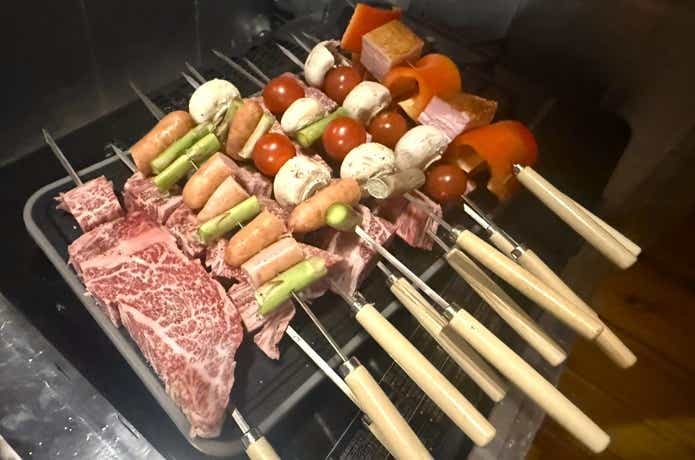 筆者は3人家族なので、さすがに20本全部とはいきませんでしたが、ステーキ肉・ソーセージ・野菜類など、15本ぐらい作成。それでもかなりボリューミーな感じにでき上がりました。