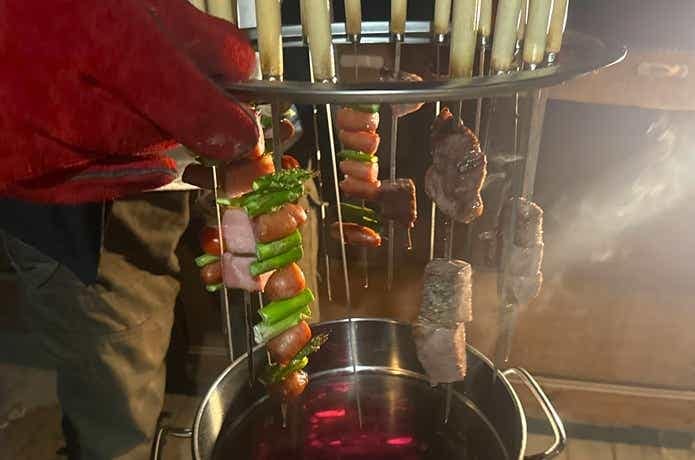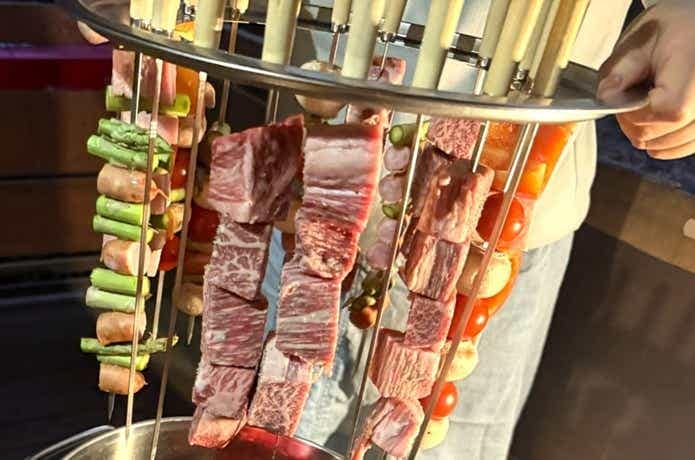 最後はいよいよ、食材を刺した串を串スタンドに吊るし、調理の準備が完了! 手で持ち上げた時点では割としっかり安定しており、期待感MAXです!