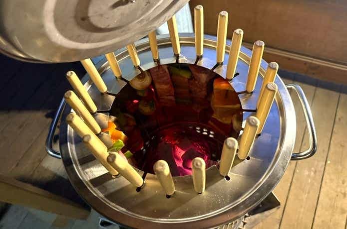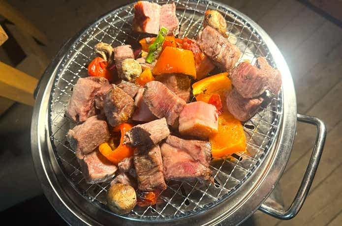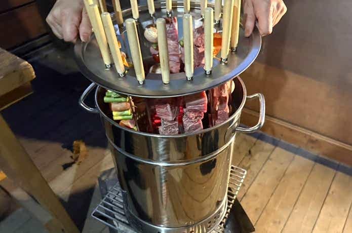 残ったものは10分程度でしっかり焼けたのですが、大きな肉類が目の前でズルズルとオイルパンの水に沈んで行く様は、なかなかのインパクト。