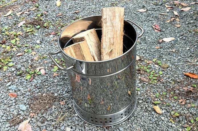 バケツと見まごう本体は、一見するとソロストーブにも見えるほどの大きさで、直径44.5×高さ81.5cmと巨大サイズです。隣のイスと比べてみると、その大きさが分かるでしょうか。