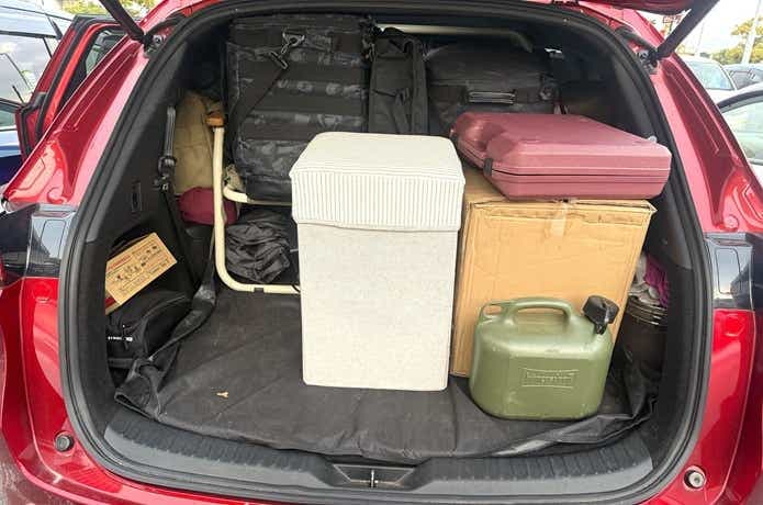 車載時はこんな感じ。右側の茶色い段ボール箱が「ハンギンググリル」で、左側のほぼ同サイズの白い箱は「フジカハイペット」という灯油ストーブが入っています。